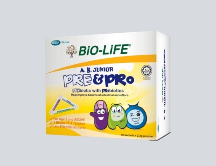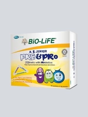AB JUNIOR PRE & PRO is an everyday prebiotic and probiotic designed for children. It contains two types of probiotics Lactobacilus acidophilus and Bifidobacterium lactis each with a billion viable colony forming units. It also contains prebiotics, in the form of water-soluble fibre inulin (oligofructose) that promotes growth of good gut bacteria and improves digestion and bowel movements. Together these prebiotics and probiotics improve gut health by positively altering the gut microflora. The benefits include better digestion, bowel movements and nutrient absorption resulting in healthy growth and better immunity in your child.